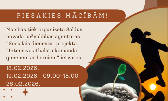 Mācības ģimenes sistēmiskajā konsultēšanā9. februāris, 2026Iespēja apmeklēt mentoru mācības.9. februāris, 2026Dienas aktivitāšu centru darbības plāns — 2026. gada februārī4. februāris, 2026Bezmaksas lekcijas par atkarībām un līdzatkarību – zināšanas, kas palīdz saprast un rīkoties.27. janvāris, 2026Bezmaksas nodarbību cikls vecākiem “Ceļvedis audzinot pusaudzi”26. janvāris, 2026Noslēgušās mācības ģimenes asistentiem.23. janvāris, 202612345›»