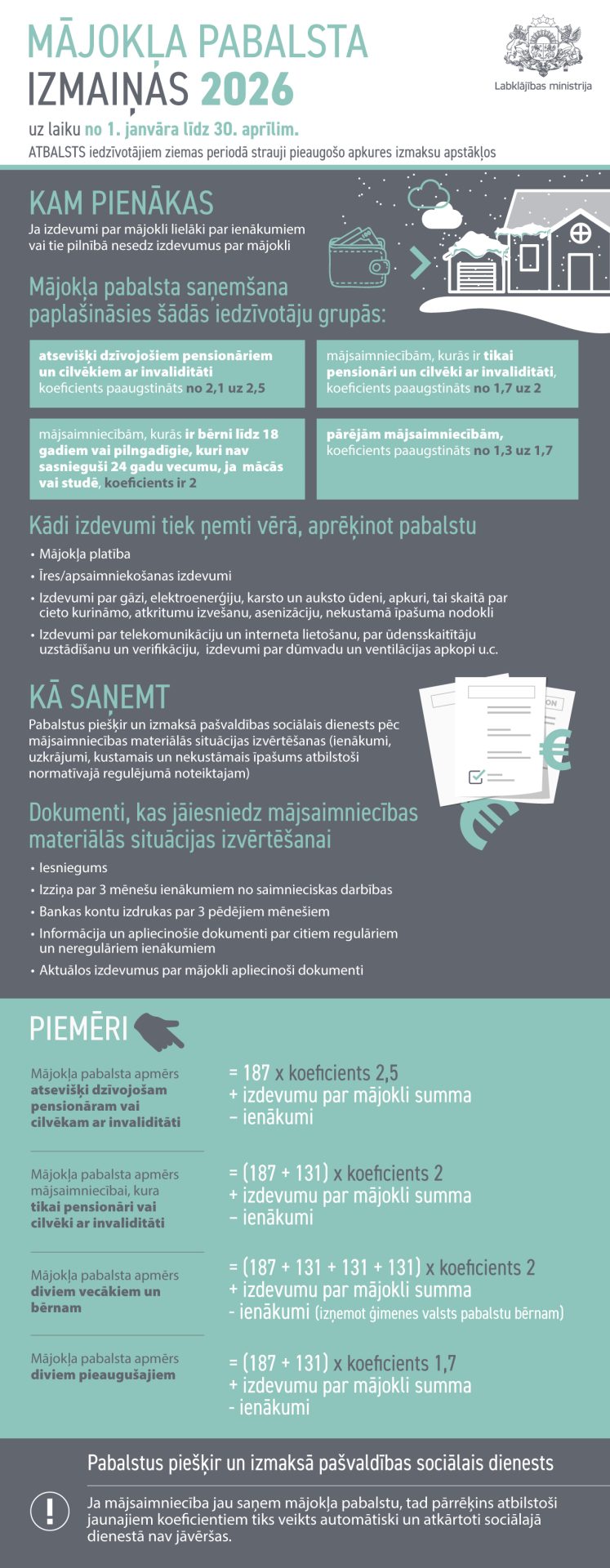 Izmaiņas paredz šīs ziemas periodā – no šā gada 1. janvāra līdz 30. aprīlim – palielināt koeficientus, pēc kuriem aprēķina mājokļa pabalstu.