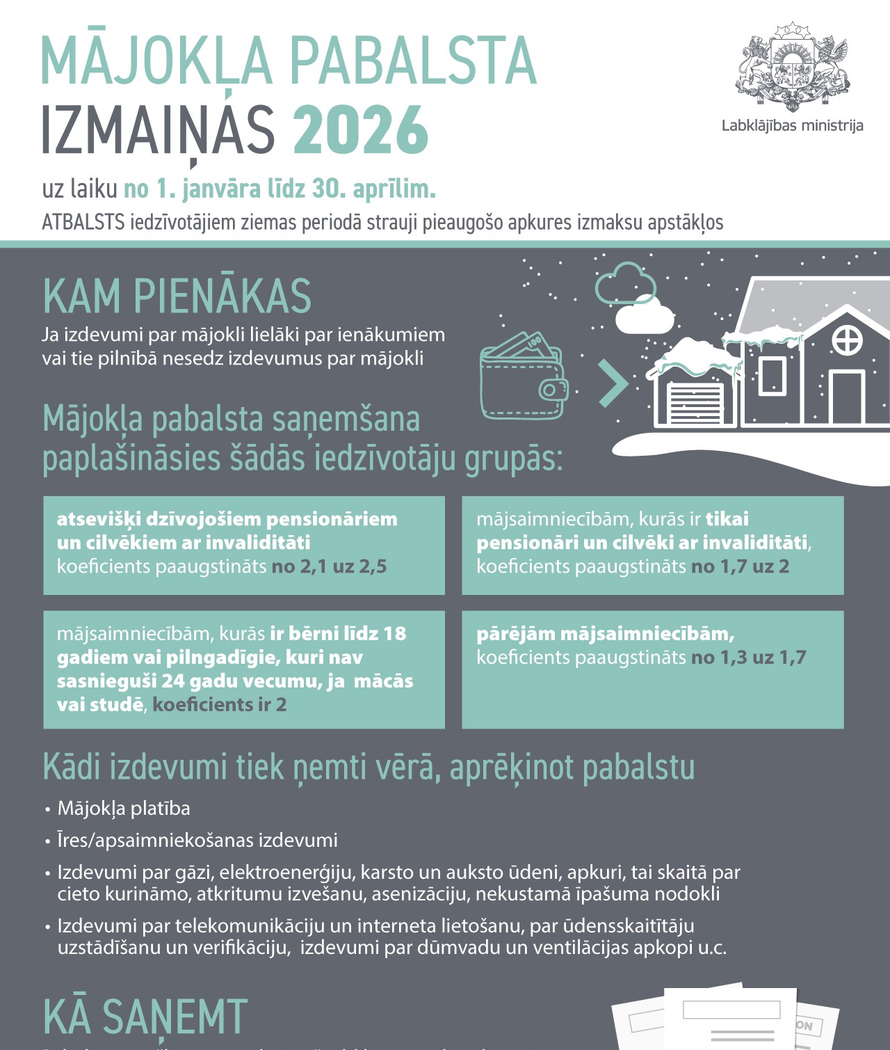 Izmaiņas paredz šīs ziemas periodā – no šā gada 1. janvāra līdz 30. aprīlim – palielināt koeficientus, pēc kuriem aprēķina mājokļa pabalstu.